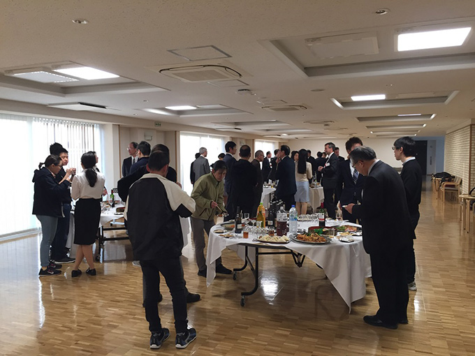 総合討論終了後には、コミュニケーションの場としてホワイエにて立食形式の交流会が開催されました。会場内のあちこちで、参加された聴講者が講演いただいた方や教授に熱心に質問をされる姿が見受けられました。