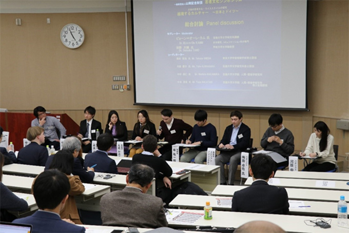 2月19日、山岡記念財団主催「第4回若者文化シンポジウム 越境するカルチャー ~日本とドイツ~」が京都大学 文学部校舎で開催されました。シンポジウムの第1部、第2部それぞれの進行を務められた財団の諮問委員でもある吉田教授・田野教授、そして発表者・パネリスト・次年度研究助成採択者も含め、総勢55名の聴衆者の方が参加しました。
