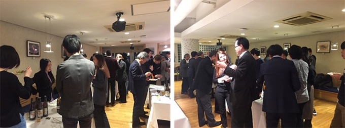 またシンポジウム終了後には、京都大学キャンパス内のカフェレストラン カンフォーラにて交流会が開催され、40名の方が参加されました。シンポジウムとは異なり、和やかな雰囲気となった交流会では、あちらこちらで発表者と熱心に言葉を交わすお客さまの姿や、発表者と次年度採択者の間で意見交換する姿などが見受けられ、終了時間を過ぎても話しが尽きない様子でした。