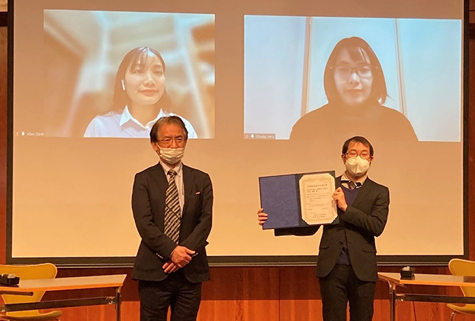 シンポジウムの最後に、2022年度 研究助成採択通知書の授与式を行いました。採択者3名のうち、当日来場された1名に、雪野常務理事から通知書が手渡され、「今後も頑張って下さい。」と激励の言葉が送られました。