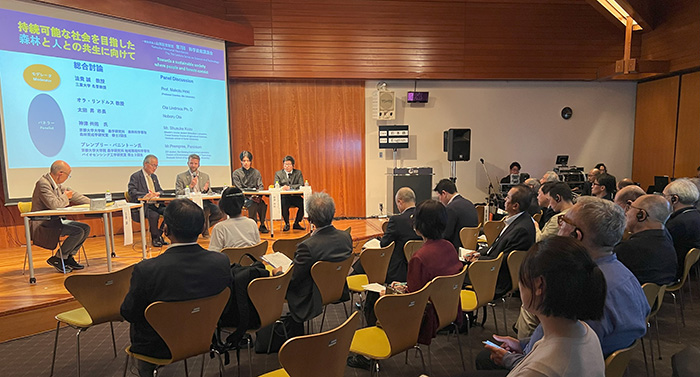 第2部の総合討論では、三重大学の法貴名誉教授をモデレータに迎え、スウェーデン農業科学大学リンドルス教授、岡山県真庭市太田市長の講演者2名に加えて、京都大学農学研究科学生である神津さん、タイ出身で同じく京都大学農学研究科学生であるプレンプリーさんをパネリストとして迎えました。聴講者からの多くの質問に加え、森林を今後どのように管理していくか、森林の活用方法など、森林と人との共生について、様々なバックグラウンドを持つ方々の活発な討論が行われました。