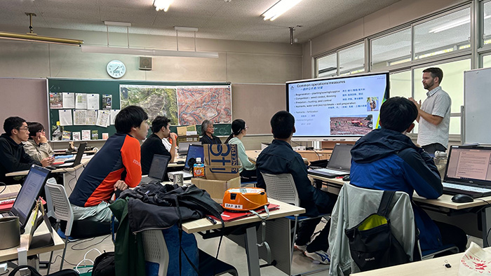 リンドルス教授からの日本の森林管理の現場を視察したいという要請を受け、翌日、森林環境管理を担う人材養成機関である奈良フォレスターアカデミーを訪問、吉野杉の森林を視察するとともに、アカデミーでリンドルス教授による特別講義が行われ、参加した生徒たちからは活発な質疑応答がありました。また、その後、授業の一環としての選木の口頭試験にも参加、森林分野の日欧の国際交流に貢献いただきました。